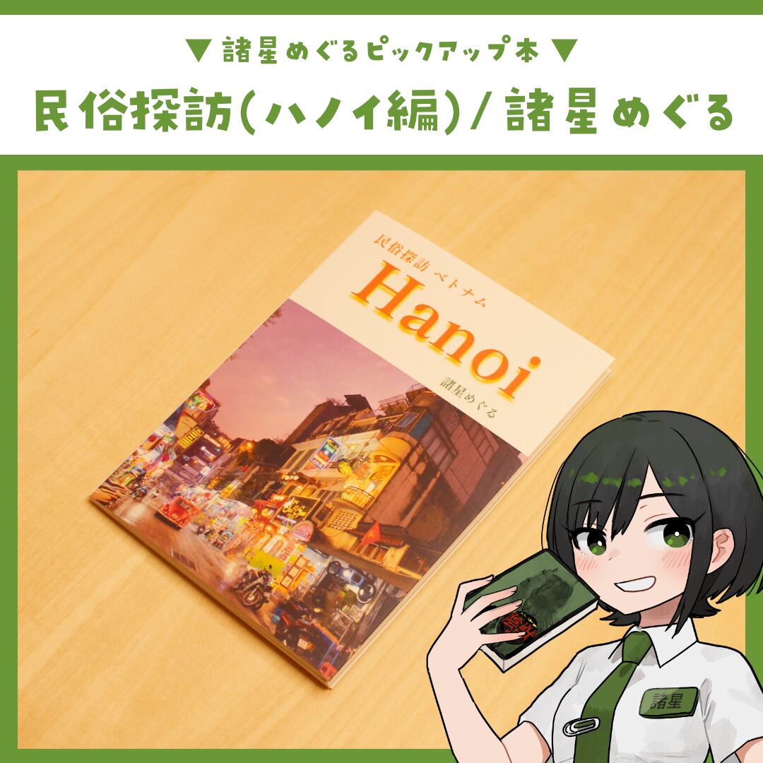 当店の諸星めぐるがベトナムハノイを旅したときに「民俗」に着目して撮影した写真集です。ベトナムらしいバイクの風景・ゴミ回収や軒先の鳥かご・マーケットに所狭しと陳列された果物・ハノイの繁華街の夜景など、諸星のコメント付きでご紹介しています。